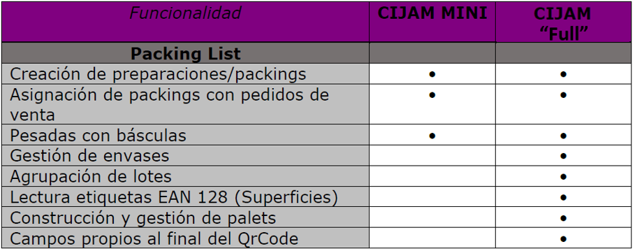 Las funcionalidades a destacar del módulo Packing List MINI son: