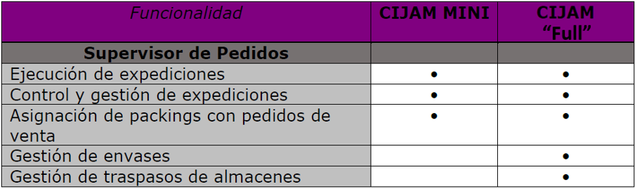 El uso de CIJAM Packing List junto con el módulo CIJAM Supervisor de Pedidos, cubren todas las necesidades propias de la fase de expedición, es decir, la fase donde finalmente se vende la mercancía transformada a los clientes. Cabe destacar que la incorporación de ambos módulos dentro del paquete CIJAM MINI es opcional y dependerá de las necesidades de cada empresa.