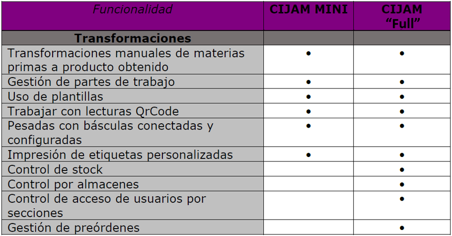 El producto CIJAM MINI está compuesto por una serie de programas informáticos (módulos) capaces de satisfacer las necesidades de una carnicería. Desde la entrada de mercancía hasta la venta al cliente (expedición), pasando por todas las etapas de transformación. Todo ello controlado y registrado por un potente, pero sencillo, sistema de trazabilidad.